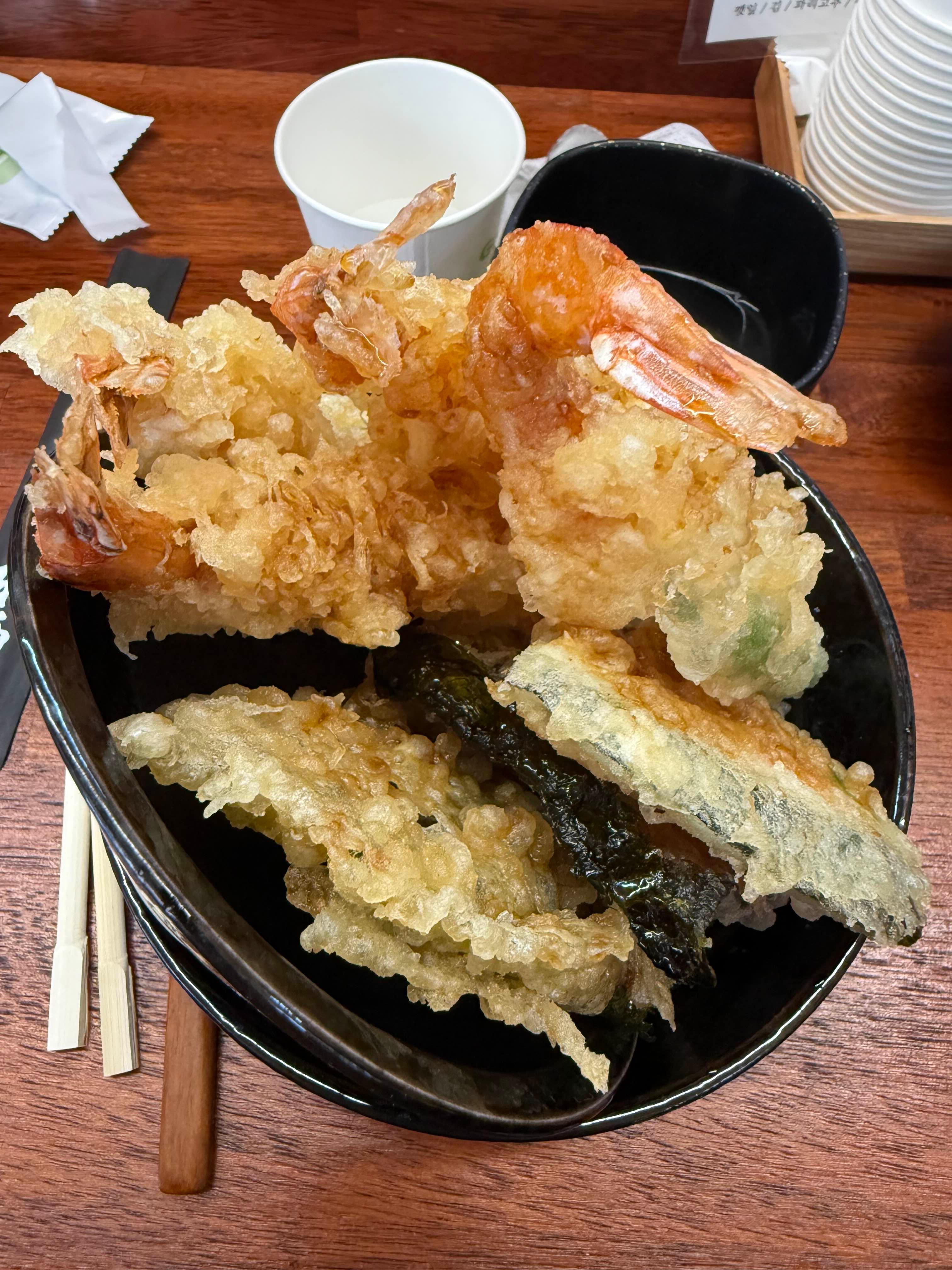 커다란 새우튀김이 그릇을 거의 덮을 정도로 올라가 있고, 옆에는 단호박·가지·김·깻잎 튀김까지 꽉 차 있어서 보는 순간 만족감이 꽤 컸어요.