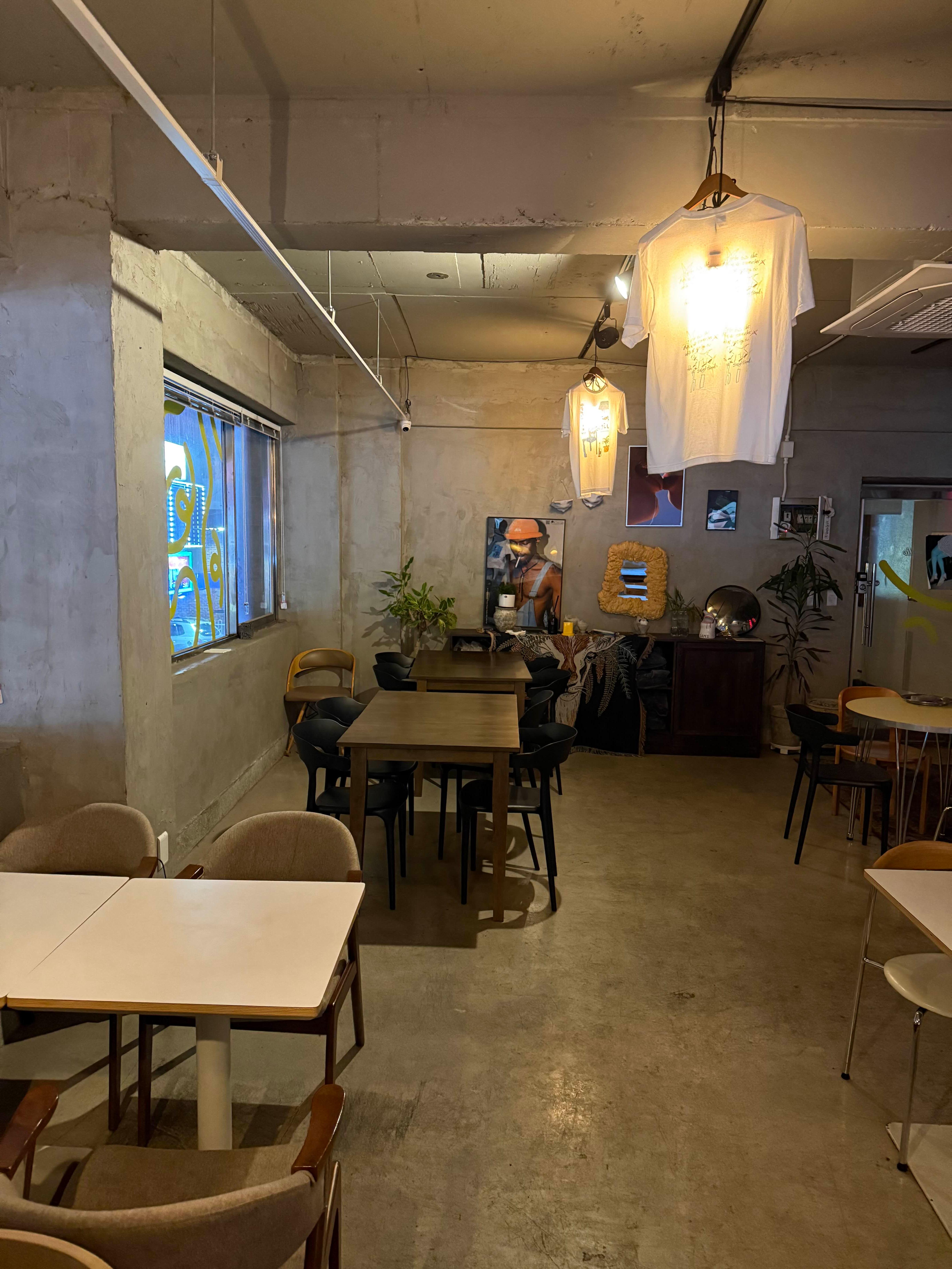 콘크리트 벽에 따뜻한 오렌지 조명, 천장에 걸린 셔츠 조형물, 벽 한쪽엔 오래된 느낌의 그림…